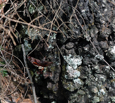 Right after I missed the Satyr, this Hawkmoth flew in, hovering just long enough to test the saps flavor. Once again, I only had time for one click. Yippie, I got him! This is the Nessus Sphinx, Amphion floridensis. The chocolate forewings and orange hindwings are cool enough, but the neat part is the double yellow striped abdomen, and the tail-like hair projections on the end of the abdomen. The Nessus is a day flyer and often can be seen nectaring on flowers.