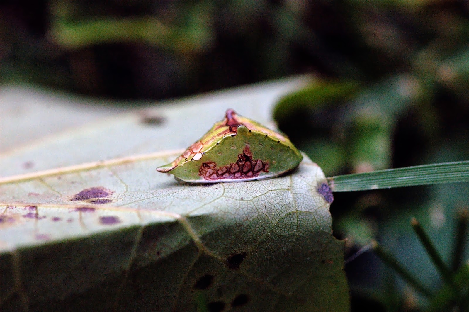 Talk about strange shapes, this one may take the cake. The Skiff Moth, Prolimacodes badia. It's bad alright. The moth is very common, I see it everywhere, but I've been waiting a long time to photograph the caterpillar. The top and sides of this hump-backed species looks like a leaf beginning to decompose.